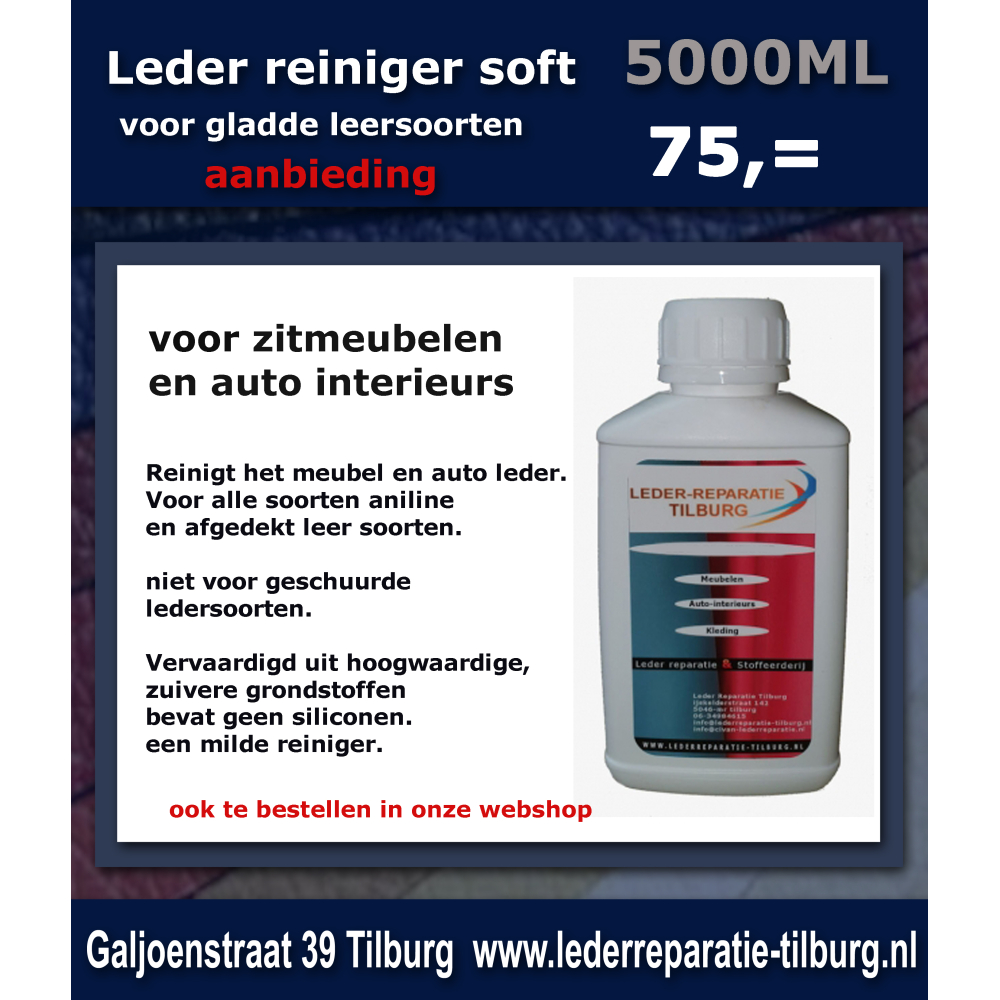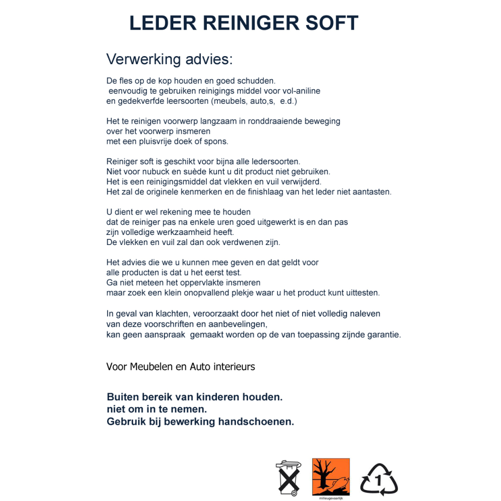 De fles op de kop houden en goed schudden. eenvoudig te gebruiken reinigings middel voor vol-aniline en gedekverfde leersoorten (meubels, auto,s, e.d.) Het te reinigen voorwerp langzaam in ronddraaiende beweging over het voorwerp insmeren met een pluisvrije doek of spons. Reiniger soft is geschikt voor bijna alle ledersoorten. Niet voor nubuck en suède kunt u dit product niet gebruiken. Het is een reinigingsmiddel dat vlekken en vuil verwijderd. Het zal de originele kenmerken en de finishlaag van het leder niet aantasten. U dient er wel rekening mee te houden dat de reiniger pas na enkele uren goed uitgewerkt is en dan pas zijn volledige werkzaamheid heeft. De vlekken en vuil zal dan ook verdwenen zijn. Het advies die we u kunnen mee geven en dat geldt voor alle producten is dat u het eerst test. Ga niet meteen het oppervlakte insmeren maar zoek een klein onopvallend plekje waar u het product kunt uittesten. In geval van klachten, veroorzaakt door het niet of niet volledig naleven van deze voorschriften en aanbevelingen, kan geen aanspraak gemaakt worden op de van toepassing zijnde garantie.