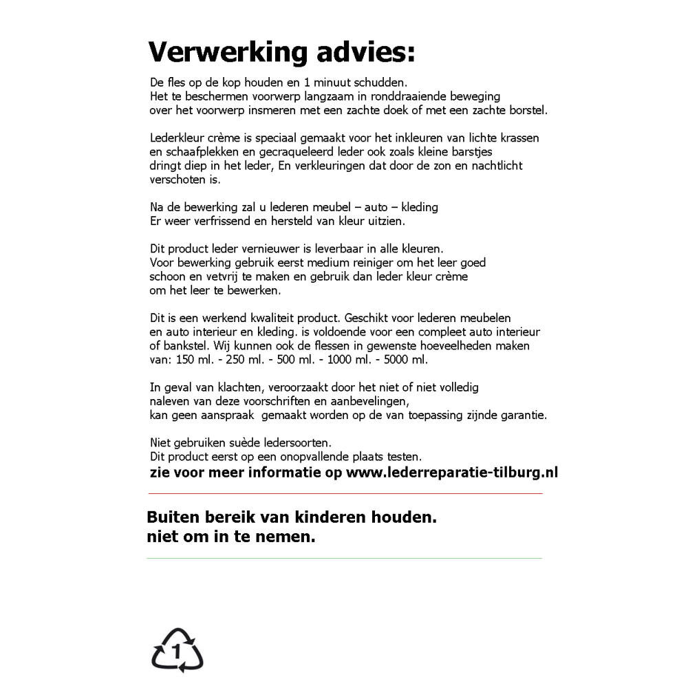 De fles op de kop houden en 1 minuut schudden. Het te beschermen voorwerp langzaam in ronddraaiende beweging over het voorwerp insmeren met een zachte doek of met een zachte borstel. Lederkleur crème is speciaal gemaakt voor het inkleuren van lichte krassen en schaafplekken en gecraqueleerd leder ook zoals kleine barstjes dringt diep in het leder, En verkleuringen dat door de zon en nachtlicht verschoten is. Na de bewerking zal u lederen meubel – auto – kleding Er weer verfrissend en hersteld van kleur uitzien. Dit product leder vernieuwer is leverbaar in alle kleuren. Voor bewerking gebruik eerst medium reiniger om het leer goed schoon en vetvrij te maken en gebruik dan leder kleur crème om het leer te bewerken. Dit is een werkend kwaliteit product. Geschikt voor lederen meubelen en auto interieur en kleding. is voldoende voor een compleet auto interieur of bankstel. Wij kunnen ook de flessen in gewenste hoeveelheden maken van: 250 ml. - 500 ml. - 1000 ml. - 5000 ml.